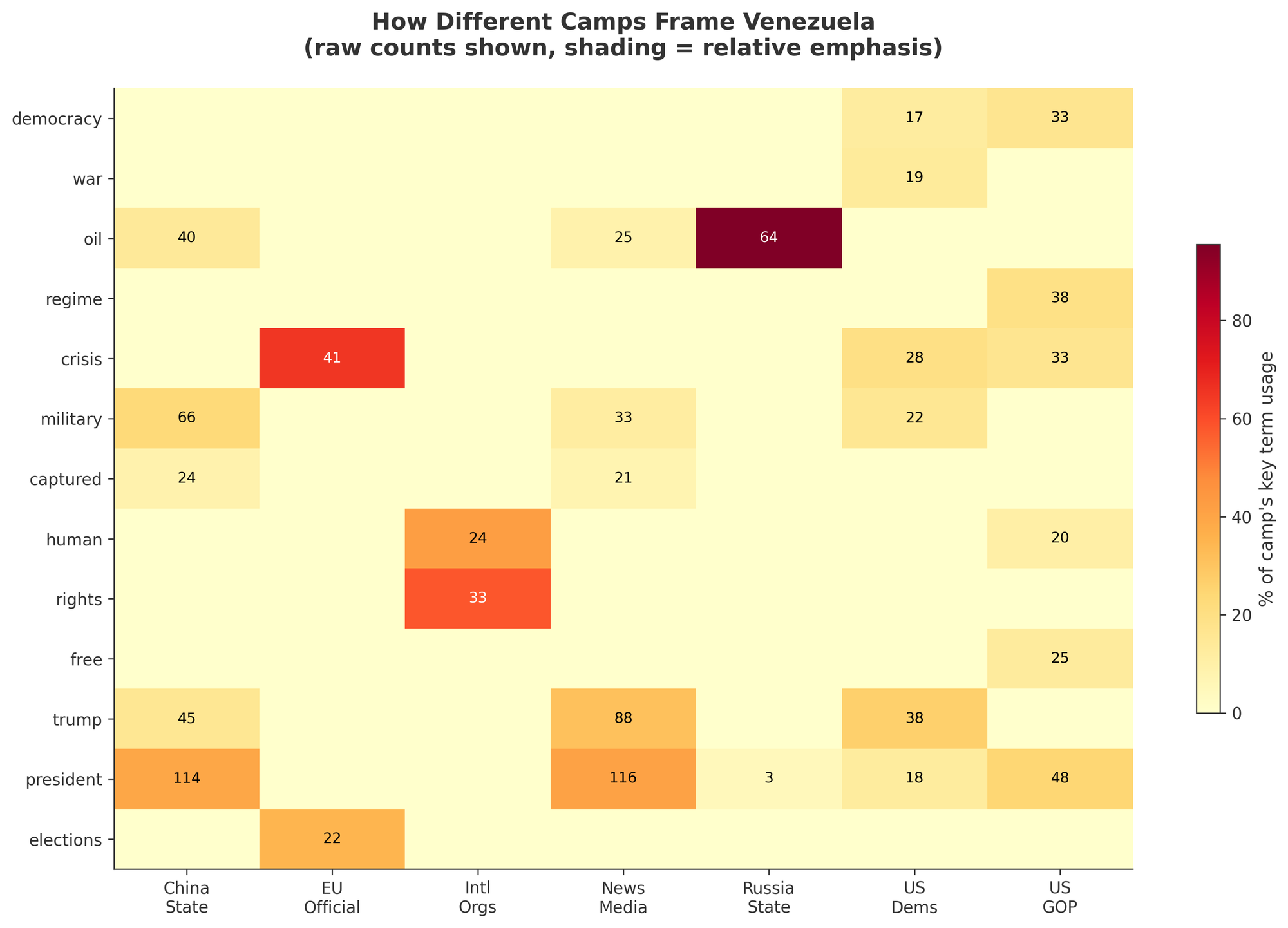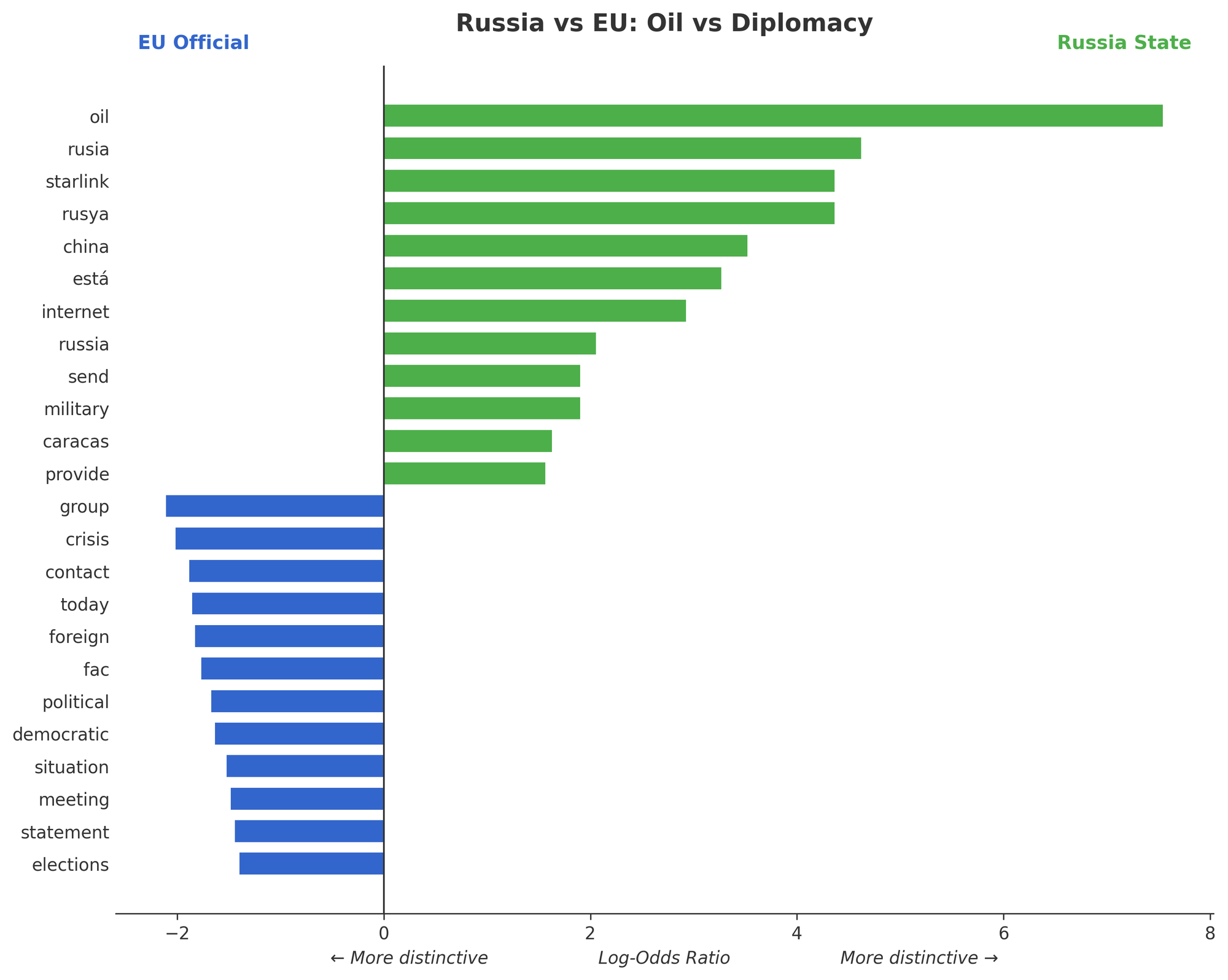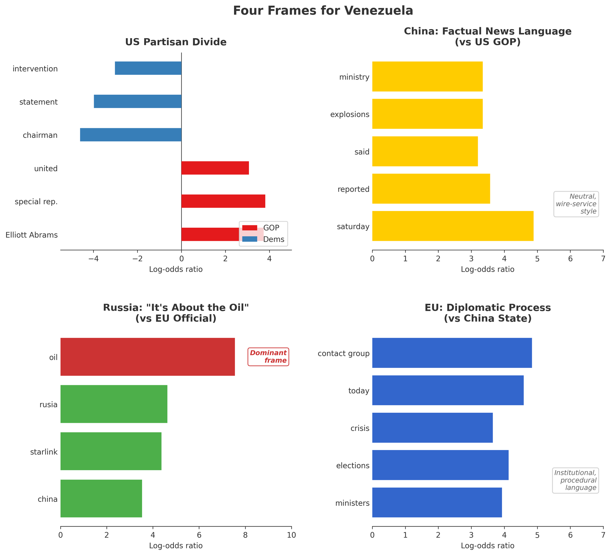 The dominant Russian frame is defined by a single, massive linguistic outlier: "oil." By reducing a liberation campaign to a resource raid, Moscow attempts to create a moral equivalence between Operation Absolute Resolve and their own predatory foreign policy. Interestingly, the Russian dataset also reveals a paranoia regarding information control, with high-frequency distinctiveness for "Starlink" and "internet," suggesting a fear that US technological superiority will bypass their propaganda firewalls.