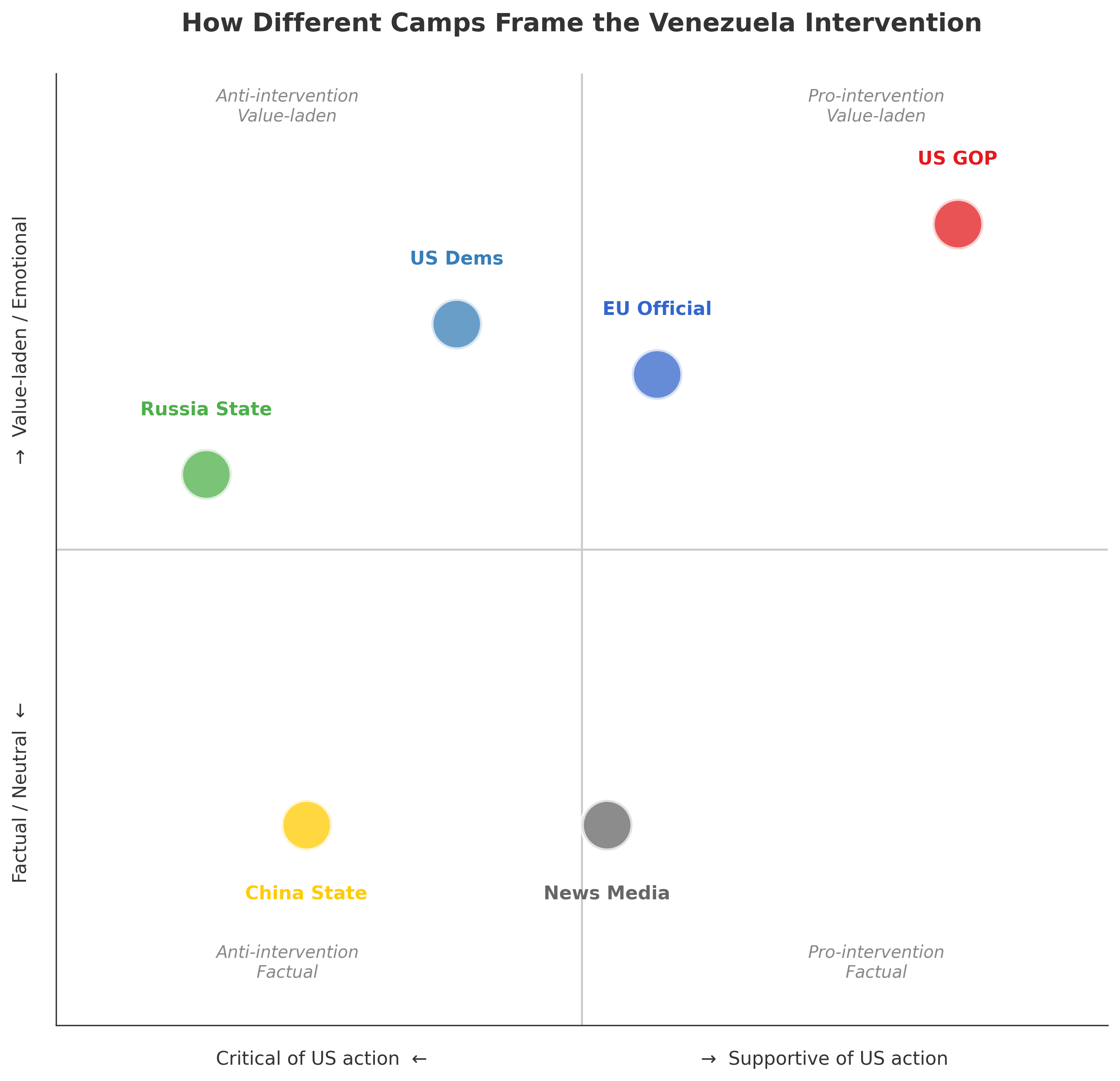 We have analyzed thousands of official communiqués and social media posts on X from the first 48 hours of the operation, mapping how six distinct ideological "camps"—the US GOP, US Democrats, China, Russia, the EU, and the legacy media—are framing this historical moment. The results, visualized in the figures below, reveal a fractured reality. Each camp is not merely spinning the news; they are inhabiting entirely different ontological universes.